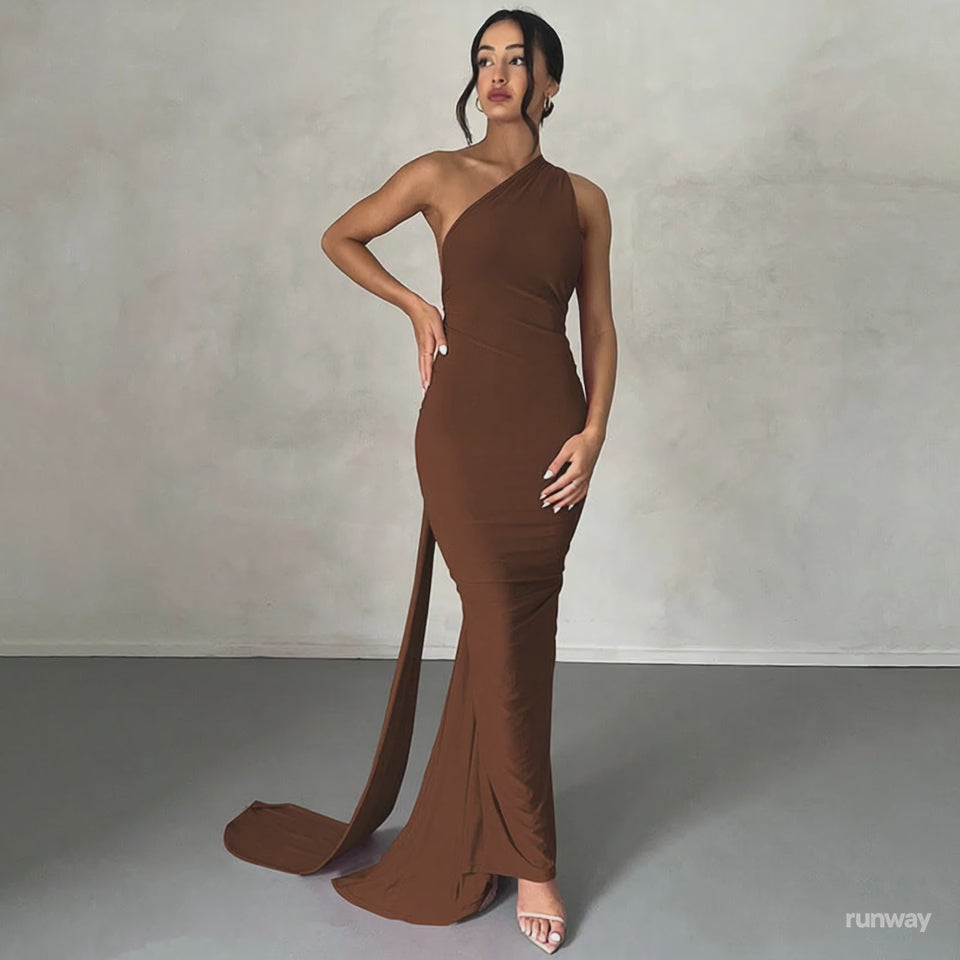A whisper of luxury — this floor-length gown with a subtle train reveals the back with delicate elegance, designed for moments that call for quiet glamour and timeless grace.